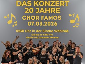 Wir laden herzlich zu unserem Jubiläumskonzert am 07. März 2026 um 18:30 Uhr in die Kirche in Wahlrod ein. Euch erwartet ein buntes Programm mit alten und neuen Hits – von ABBA bis Udo Jürgens, von Pop bis Gospel und vielen Lieblingsstücken aus unserem Repertoire der vergangenen 20 Jahre. Wir möchten mit euch einen Abend erleben, der musikalisch überrascht, bewegt und Spaß macht.
